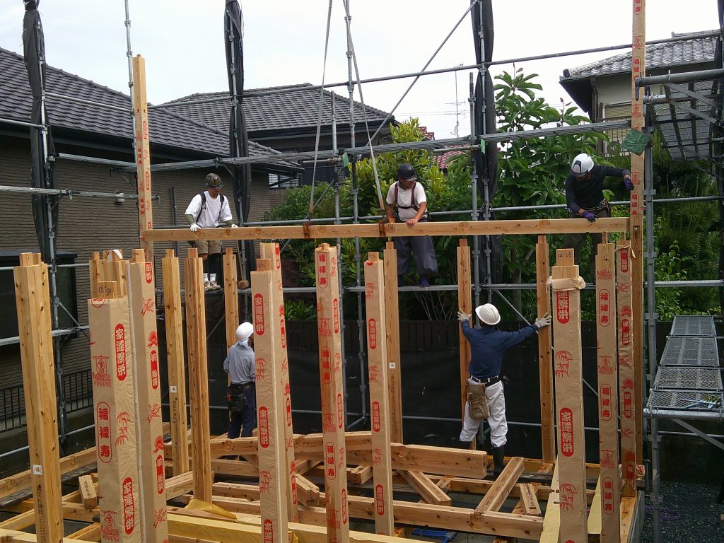 柱を建て終えたら、一番奥の梁から掛けて行きます。