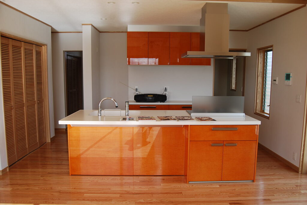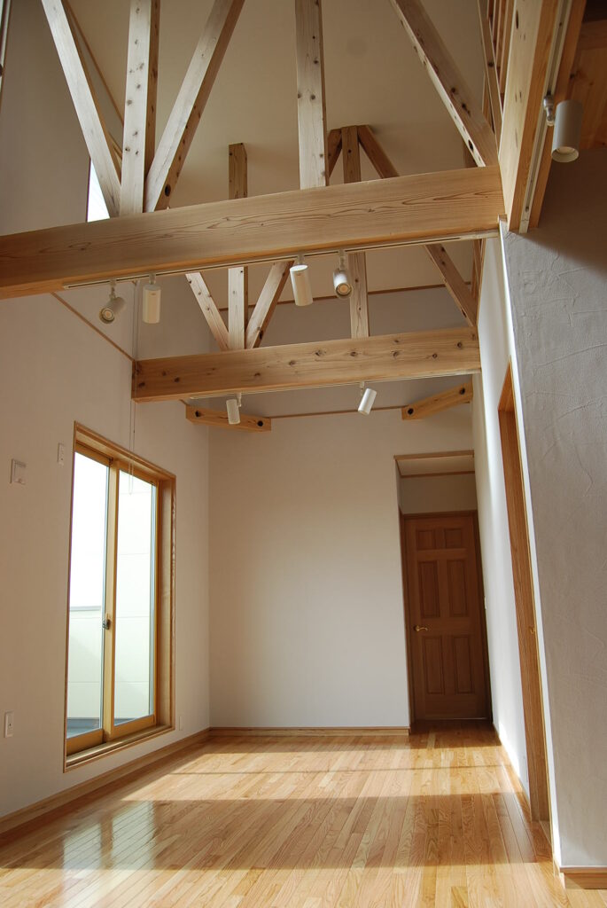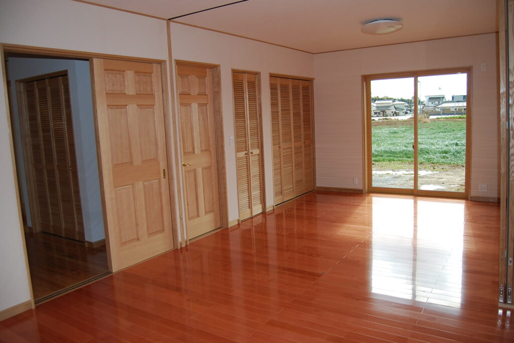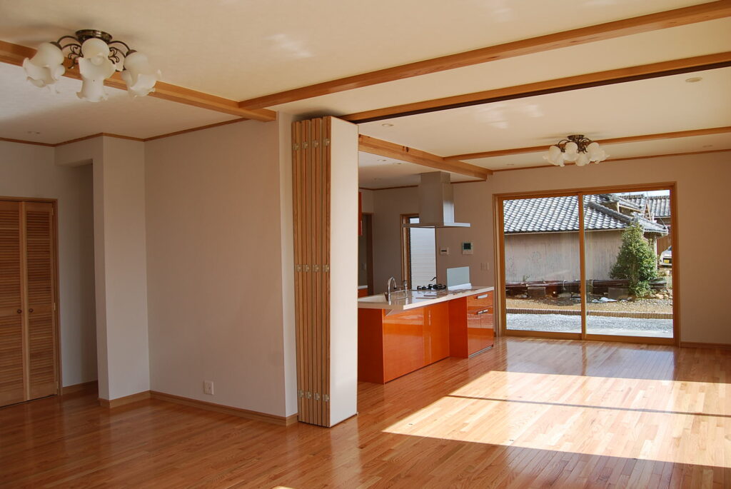 フローリングをはじめ内部ドアなども全て無垢材です。写真はLDKですがここに階段があり、2階ホールと繋がっています。