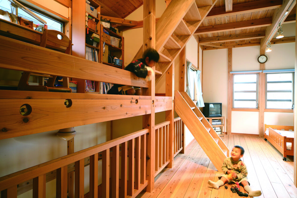 2階から見れば中二階部ですがここは1階の吹き抜けの天井になっています。つまり手摺の下は1階になっていて、もちろん音は筒抜けです。またこの中二階部も子供室として2階ホールと共に使えます。